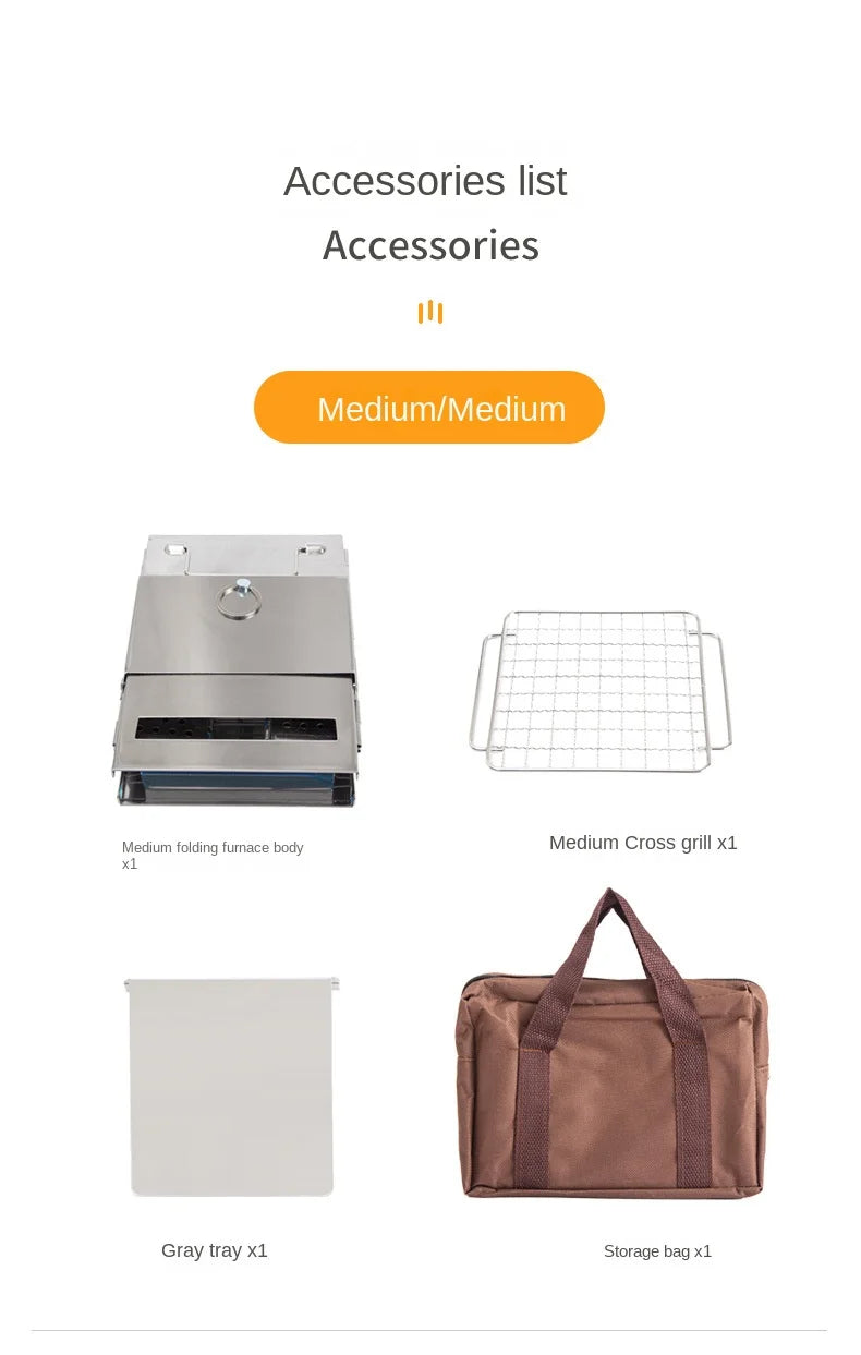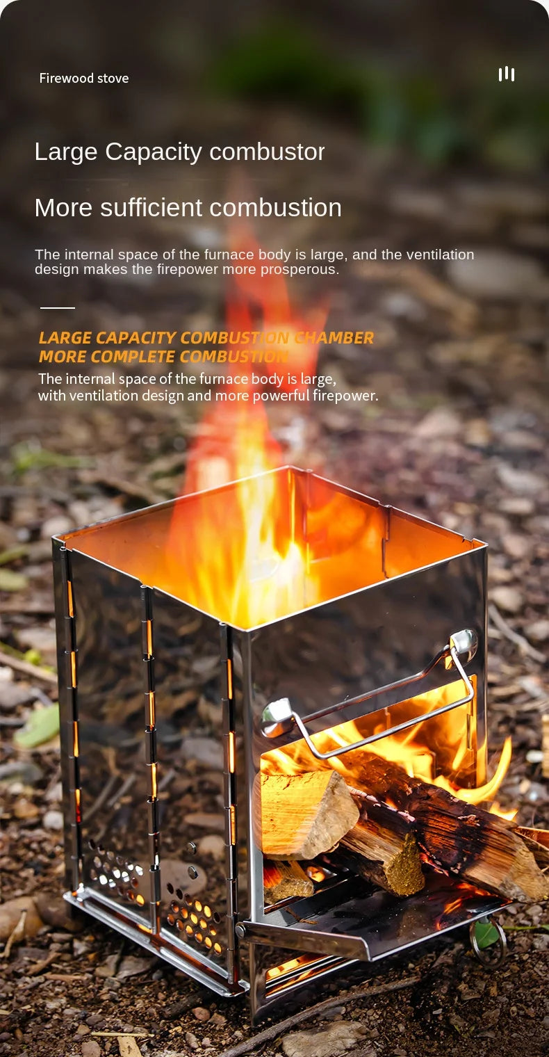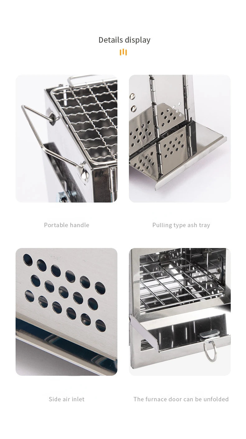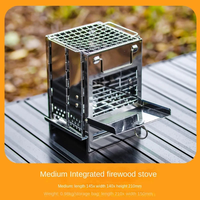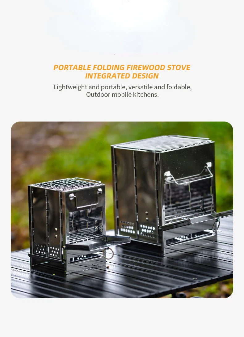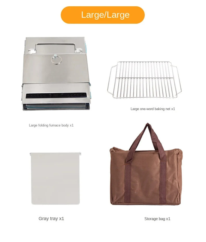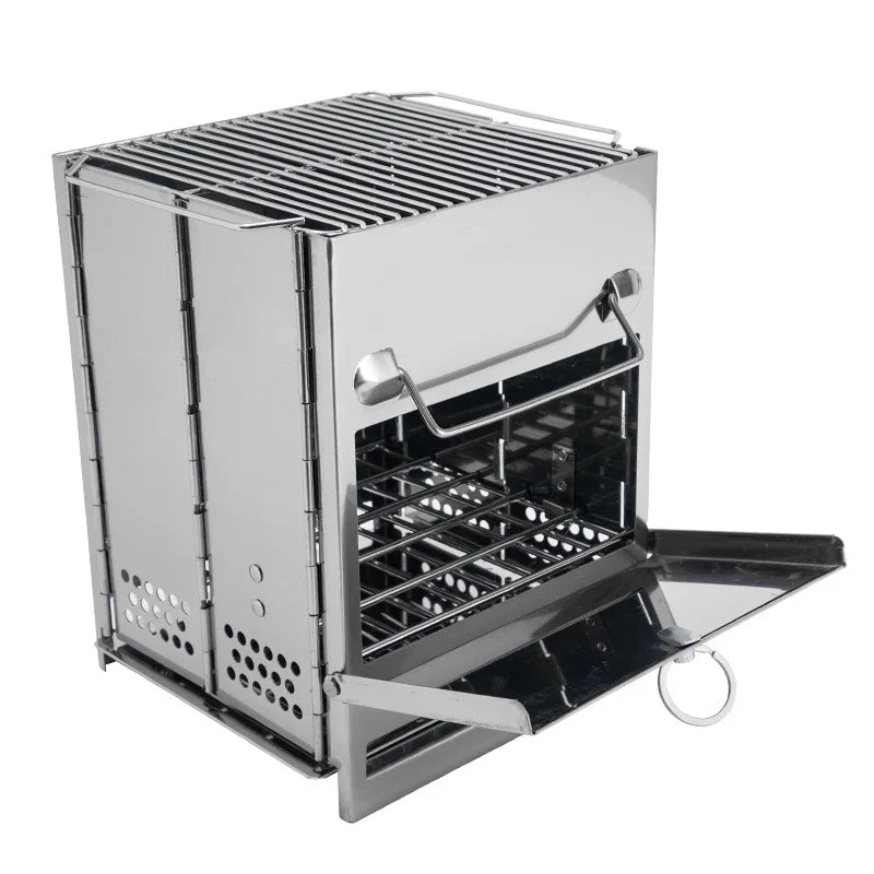 Trots sin kompakta storlek levererar denna spis en kraftfull värmeeffekt på upp till 105°C, perfekt för att snabbt och jämnt tillaga kött, fisk, grönsaker eller till och med pizza. Du kan använda både ved och kol, så att du alltid uppnår önskad grillsmak. Dess smarta, hopfällbara design gör den enkel att transportera eller förvara utan att ta upp plats – perfekt för bilen, husbilen eller ryggsäcken.