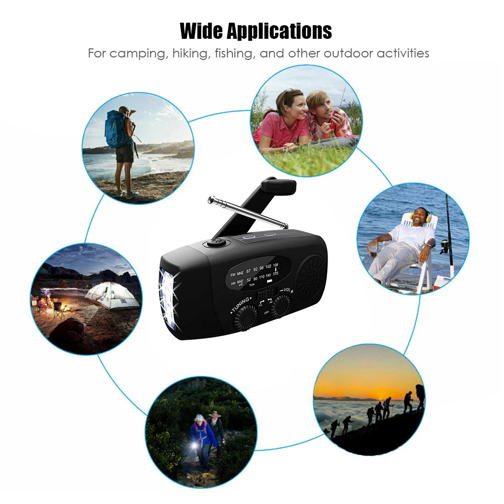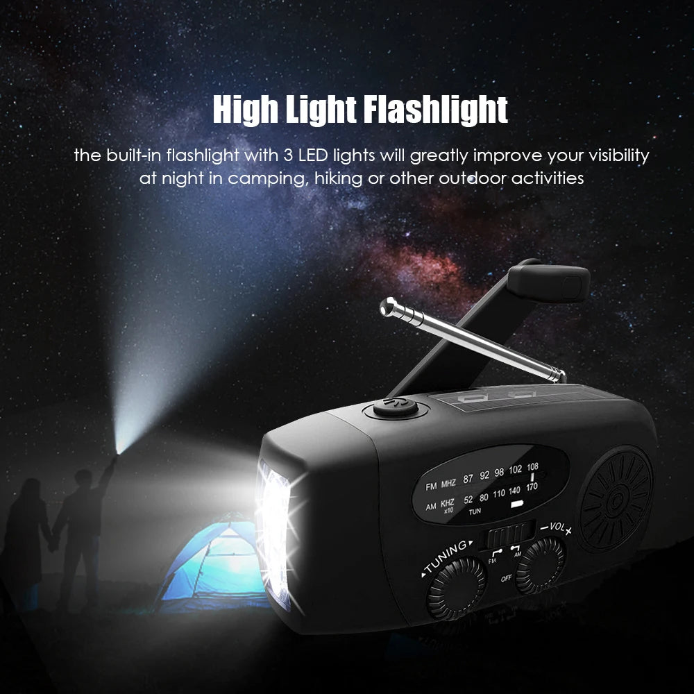 Det kraftfulla batteriet på 2000 mAh gör mer än att bara driva radion. Det fungerar också som en nödbatteribank, så att du kan ladda din telefon när varje procent av batteriet räknas. Den ljusa LED-ficklampan med tre ljus ger ett klart ljus i mörkret – perfekt för camping, vandring eller som nödbelysning hemma.
