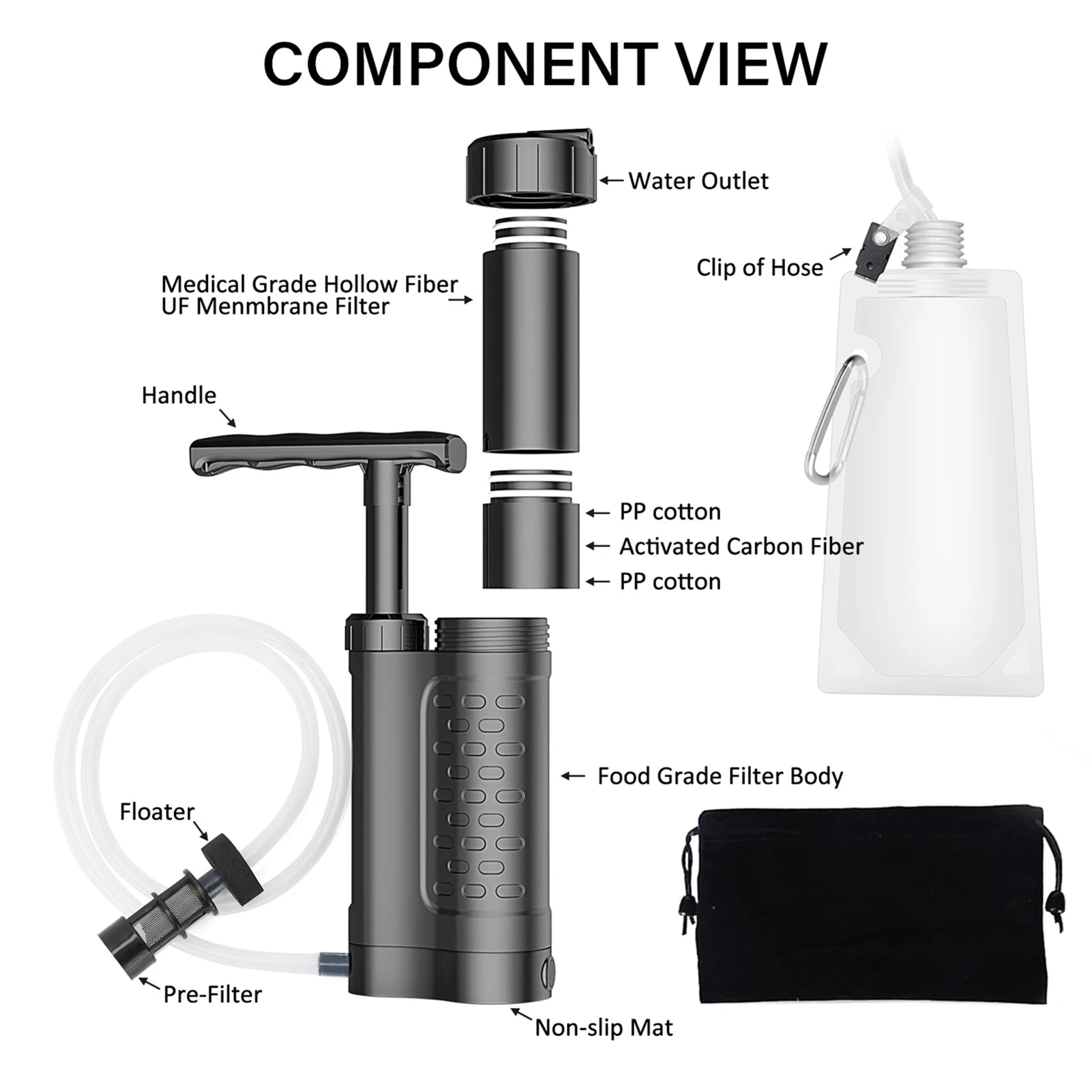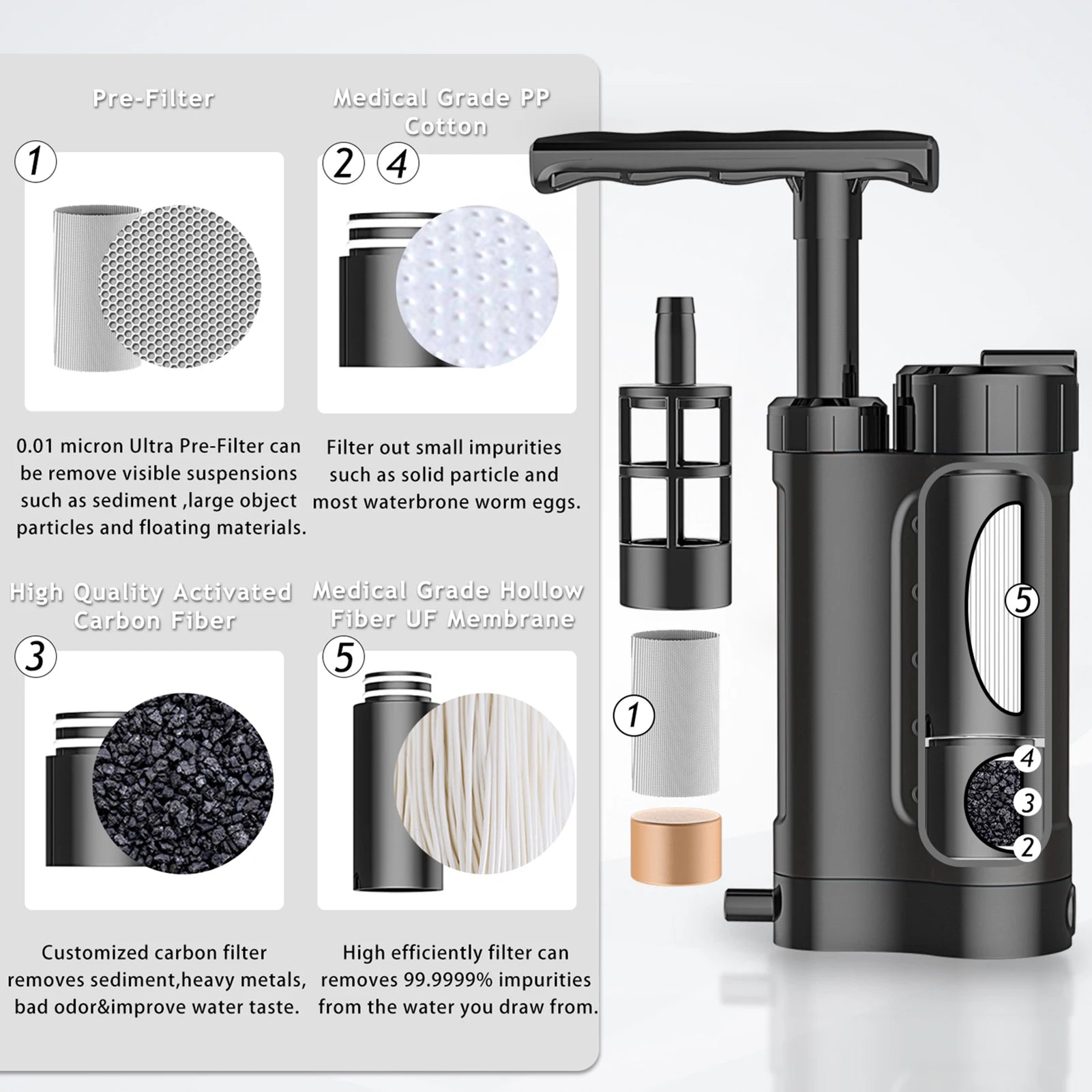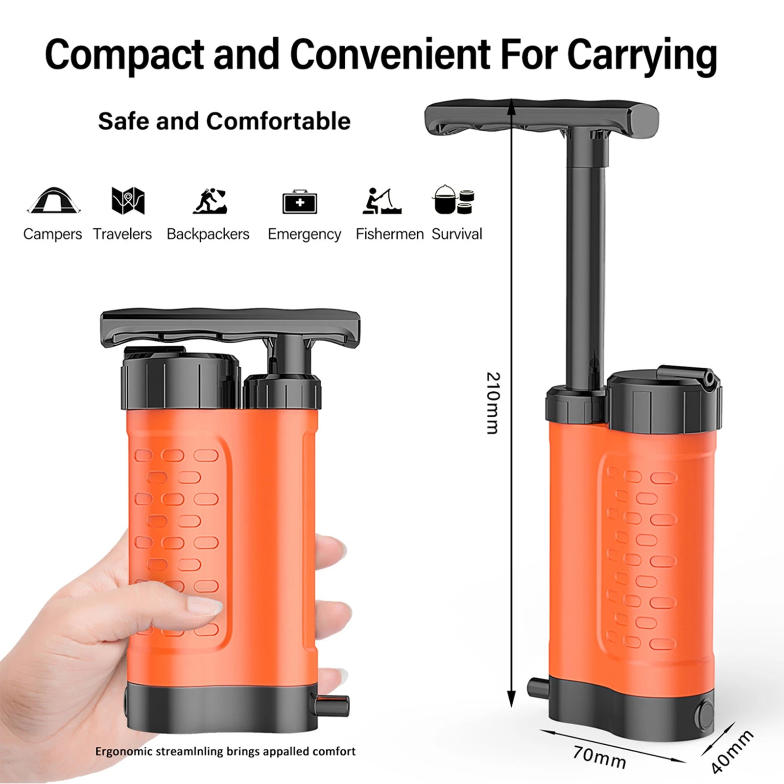 Oavsett om du vandrar genom bergen, campar vid en bergsbäck eller förbereder dig för nödsituationer är tillgång till rent dricksvatten avgörande. Denna bärbara vattenfilterpump renar upp till 1000 liter vatten från floder, sjöar och andra naturliga källor. Med ett kraftfullt 4-lagers filtreringssystem tar den bort 99,99 % av bakterier, protozoer och sediment, så att du kan dricka säkert var du än är.